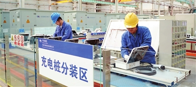 图为落户东丽区华明高新区的天津平高易电科技有限公司工人赶制充电桩。