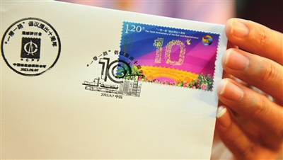 9月7日,中国邮政发行《“一带一路”倡议提出十周年》纪念邮票一套1枚,邮票图案以花卉、和平鸽,以及代表基础设施合作和互联互通概念的公铁运输车辆、货轮、起重机等元素共同组成的数字“10”为主体,并结合“丝路金桥”元素。邮票由北京邮票厂有限公司影写工艺印制,另与香港邮政、澳门邮电共同印制同题材小本票1本。全套邮票面值1.20元,计划发行数量705万套。图为9月7日在中国邮政邮票博物馆拍摄的《“一带一路”倡议提出十周年》纪念邮票及首日封。 新华社发