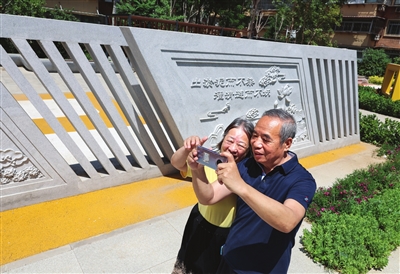 在河东区翠韵里社区居住20多年的张君祥和卢瑞亭老人用手机拍下建成后的廉洁口袋公园,见证社区越来越好的变化。