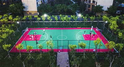 西青区家兴公园内设有篮球场、乒乓球场、健身器材和休闲长凳,让居民在公园散步赏景的同时能休憩和锻炼身体。