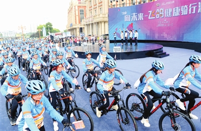 昨天下午,“向未来,飞鸽健康骑行”活动在津湾广场鸣枪,100余名青年骑手分别从津湾广场和天津大学出发,向沿途市民、游客宣传美丽天津。 本报记者 钱进 摄