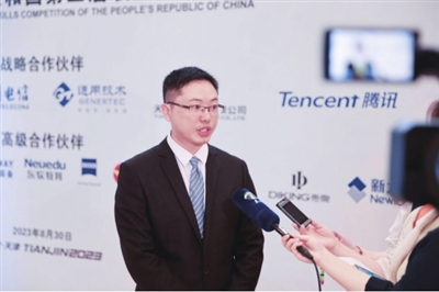 记者采访了大赛高级合作伙伴、帝牌(中国)有限公司副总经理李裕锦。他介绍:帝牌是一家集服装生产、品牌推广、研发设计、终端销售为一体的综合性服装生产企业。作为本届大赛高级合作伙伴,将为所有参赛选手、裁判员、志愿者、赛事工作人员等1万多人提供10种不同品类的赛事服装。为做好本届大赛的服装保障工作,帝牌提前规划,组织研发设计团队,对服装进行专门设计,将本届大赛主体风格与天津特色文化理念相结合,进一步凸显中国职业技能高端水平及大国工匠精神,打造专属于本届技能大赛并融合天津文化符号的服饰名片。