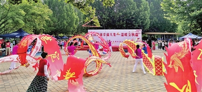 阳光明媚、绿树掩映,大集现场人头攒动,演出人员手中彩带上下飞舞、辗转盘旋,围观居民纷纷鼓掌叫好、拍照留念。