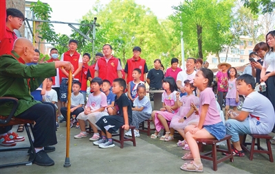 在花园里二段社区“石桌板凳汇”,老红军在为居民讲述革命历史。