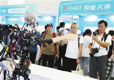 17日,第二届全国技能大赛开放观众观摩。图为展示交流馆内观众参观康复机器人。 本报记者 姜宝成 刘欣 摄