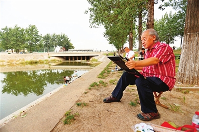昨日,大运河八孔闸路一带水面平静,两岸草木葱茏,不少游人在此游玩,沐浴在温和的秋光中。见到此情此景,画家们心中涌起创作冲动,他们选好点位,架起画板,开始了写生创作。运河边的一草一木,远处的高楼民居和享受美好生活的游人,都成为了画家们的创作素材。在市美协副主席孟庆占的画中,近处的芦苇、水鸟与远处的桥梁、树木、游人共同构成了一幅生态之美的图景,他对记者说:“我们的画笔不仅追忆运河古韵,也表现今天的生态大美。在新时代,运河的画卷更加美丽,给我带来了很多灵感。”