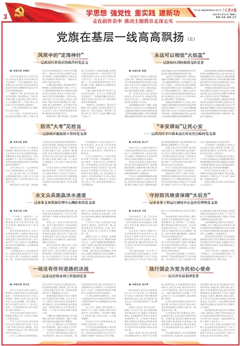 “水情就是命令,防汛就是责任。测验水情党支部共有9名党员,所有人第一时间到岗,迅速投身一线。水情科是防汛抢险的前哨,支部党员算准算细洪峰洪量,细致推导洪水演进时序。”市水文水资源管理中心测验水情党支部书记陈晓虎说。