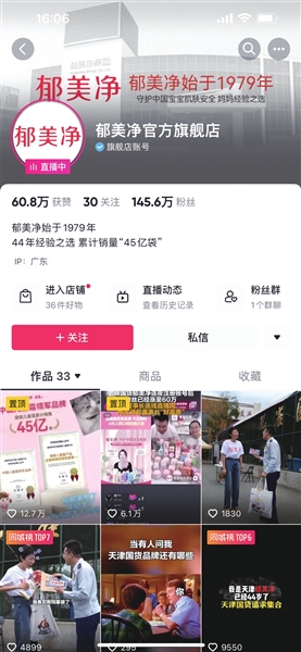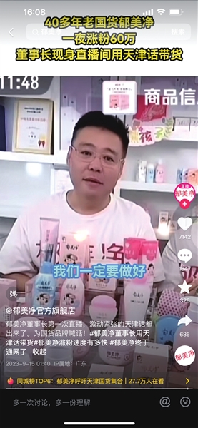 郁美净集团董事长、总经理史滨现身直播间带货,2023年9月13日晚,郁美净官方账号在抖音平台上连夜注册,几天粉丝量突破146万。