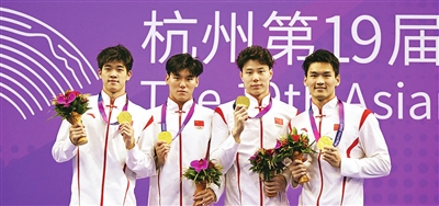 杭州亚运会游泳项目男子4×100米混合泳接力决赛昨晚上演,天津选手王长浩(左图左2)携手队友徐嘉余、覃海洋、潘展乐以3分27秒01的成绩轻松摘金,同时刷新了该项目的亚洲纪录。继赛艇项目的鲍丽郡之后,王长浩夺得了天津运动员在本届亚运会上的第二枚金牌。