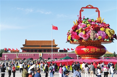 9月27日,市民游客在天安门广场参观“祝福祖国”巨型花篮。 新华社记者 鞠焕宗 摄