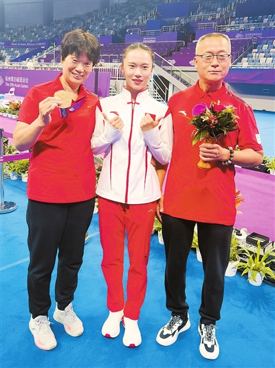 这一刻,她享受的不仅有胜利的喜悦,更有家人朋友陪伴和见证的幸福。曾经的“蹦床公主”何雯娜现场为朱雪莹加油。朱雪莹的父母也来了。这也是朱雪莹的父母第一次到现场来为女儿加油助威。“之前因为上班等原因,在国内的比赛爸妈都到不了现场,在国外的比赛他们更不可能去。这次正好是假期,我就给他们买了票,希望他们能过来看我比赛。”在爸妈的注视下,在家门口夺冠,朱雪莹说,这份幸福感加倍。朱雪莹父母身着印有国旗标志的红色T恤,他们希望给女儿带来好运。雪莹妈妈说:“真的非常紧张,第一次现场看她比赛,心跳得特别快。”女儿常年在外征战,当妈的更多是惦记和心疼。看着女儿一朝梦圆,打心底里感到欣慰。雪莹爸爸说:“在家门口看着雪莹拿到亚运会冠军,特别光荣和自豪,非常激动。非常感谢国家和天津对雪莹的培养和支持。”此前一直面带微笑的朱雪莹,在和爸妈拥抱的那一刻,眼圈泛红。在自己战斗的赛场,朱雪莹和爸妈拍了一张“全家福”(左图)。她为妈妈挂上金牌,将捧花献给爸爸,一家人开着玩笑,其乐融融。的确,当外界都在关注她“飞得高不高”时,只有家人更关心她“飞得累不累”。在爸妈面前,她永远是那个“长不大的孩子”。