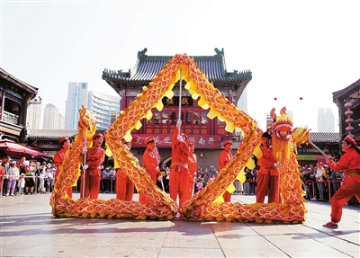 昨日,南开区古文化街推出高跷、舞龙、古彩戏法等表演。