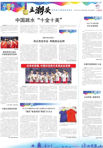 本报杭州电(记者 苏娅辉)杭州亚运会跳水比赛昨天在杭州奥体中心游泳馆迎来收官日,随着陈艺文和昌雅妮包揽女子3米跳板冠亚军,杨昊和白钰鸣包揽男子10米跳台冠亚军,中国跳水队收获“十全十美”。