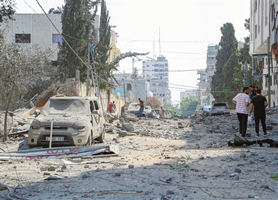图为10月8日,巴勒斯坦人在加沙城查看以色列空袭后的街道。