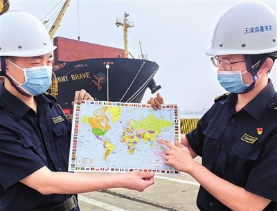 近日,天津南疆海关查验国际航行船舶入境换班船员携带的行李时,发现并扣留1张“问题地图”,该地图存在将我国台湾省按国家名称标注、错误绘制国界线等问题。 本报记者 马晓冬 图片由天津海关提供