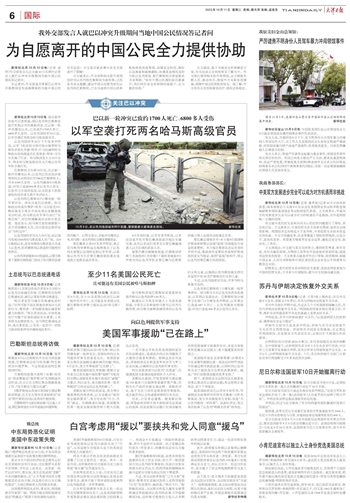 汪文斌表示,外交部和相关驻外使领馆针对以色列和巴勒斯坦当前形势,已经发布安全提醒,建议中国公民暂勿前往以色列和巴勒斯坦,已在当地的中国公民和机构保持高度警惕,加强安全防范,做好应急准备和就地避险,如遇紧急情况及时与驻以色列使馆、驻巴勒斯坦办事处联系寻求帮助。“如有中国公民现阶段自愿离开,我们将在安全有保障的前提下,全力提供协助。”