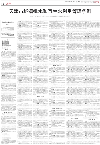 《天津市城镇排水和再生水利用管理条例》已由天津市第十八届人民代表大会常务委员会第五次会议于2023年9月22日通过,现予公布,自2024年4月1日起施行。