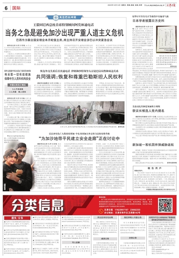 王毅表示,中方对巴以紧张局势加剧,造成大量平民伤亡深感痛心。我们反对伤害平民的行为,谴责违反国际法的做法。中方呼吁各方采取克制态度,尽快实现现地局势降温,防止战火进一步扩大。当务之急是保障平民安全,开辟救援通道,避免加沙出现严重人道主义危机。