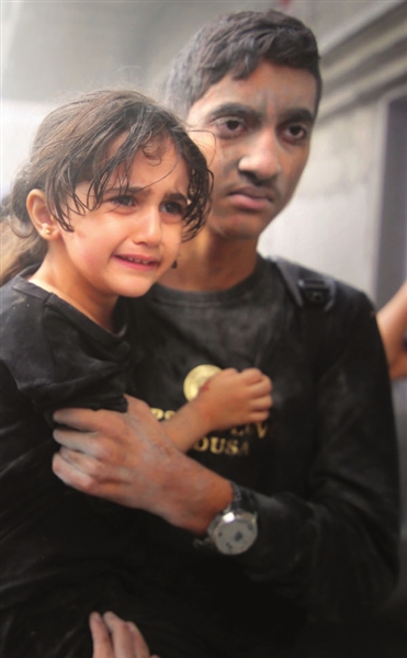 在加沙地带南部城市拉法,一名男子抱着小女孩走在遭以色列空袭的受损建筑中。