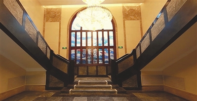 来到徐树强旧居的室内,可以看到不光它外面是完全对称的,室内也是完全对称的,从大门一进来就看到这个大厅,两边有两个完全对称的镜子。再往里走,就会看到一个对称的楼梯以及正中间的彩窗画,并且用很多元素加强了这种对称感,这在现代建筑里是比较少见的。