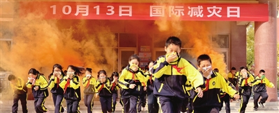10月13日是国际减灾日,各地学校开展防灾减灾知识普及和应急疏散演练等活动,以提高师生应急避险与安全自救能力。当日,山东省枣庄市东湖小学的学生进行消防应急逃生演练。 新华社发