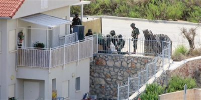 图为10月13日从黎巴嫩南部边境城镇希亚姆拍摄的照片显示,以色列士兵在以色列北部梅图拉搭建防御设施。