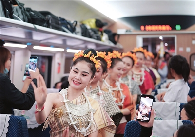 ①老挝工作人员在中老铁路上开行的D887次国际旅客列车上表演。