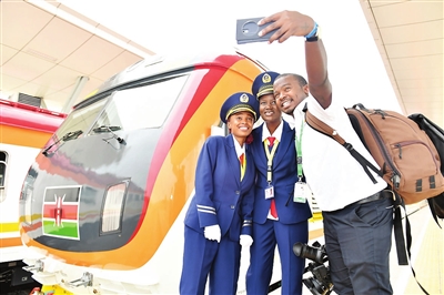 ②在肯尼亚蒙巴萨的蒙内铁路蒙巴萨西站,一名肯尼亚记者和火车司机合影留念。
