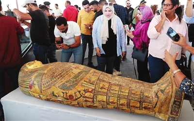 图为10月15日,在埃及明亚省考古现场,人们参观彩绘木乃伊棺椁。 新华社发
