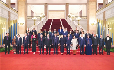 习近平和彭丽媛热情迎接外方领导人夫妇,同他们一一握手,并集体合影留念。