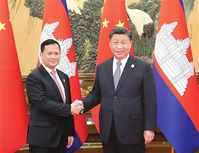 习近平强调,共建“一带一路”给柬埔寨带来了实实在在的发展机遇。中方愿秉持共商共建共享原则,推动“一带一路”倡议同柬埔寨“五角战略”对接,加快充实中柬“钻石六边”合作架构,打造好“工业发展走廊”和“鱼米走廊”,推动更多惠民工程落地生根。中方支持柬埔寨机场、文物古迹修复等项目,欢迎更多柬埔寨农产品进入中国市场,鼓励更多中国游客赴柬旅游。我愿同你一道宣布将2024年确定为“中柬人文交流年”。