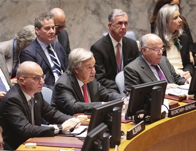 10月24日,在位于纽约的联合国总部,联合国秘书长古特雷斯(前中)在安理会巴以局势高级别会议上讲话。 新华社发