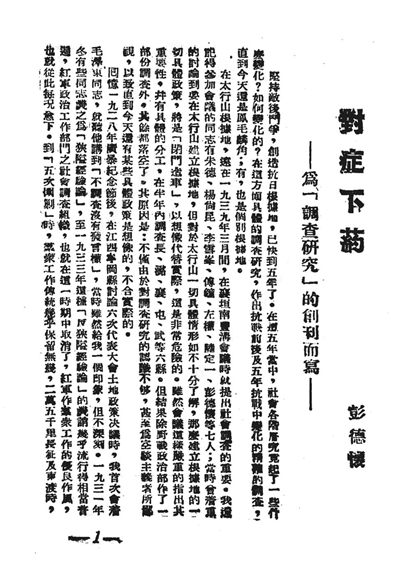 《调查研究》创刊号的第一篇文章就是彭德怀撰写的发刊词,题目为《对症下药──为〈调查研究〉的创刊而写》。据王焰主编的《彭德怀年谱》记载:“1942年4月20日,发表《对症下药》一文,阐述毛泽东关于加强调查研究的思想,要求华北党和军队的同志对中国社会和地方工作做深入的调查研究,防止空谈主义和主观主义。”