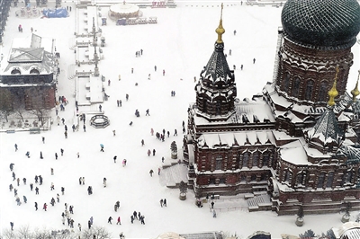 图为11月6日,游客在哈尔滨建筑艺术馆外游览(无人机照片)。 新华社发