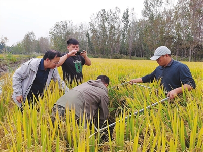 宝坻区农委的技术人员和种植户王瑞东正在开展水稻收割前的测产工作。 照片由受访人提供
