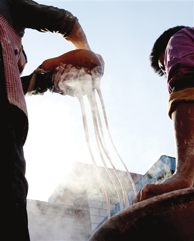 打浆后的红薯粉从瓢中漏成长长的粉条。