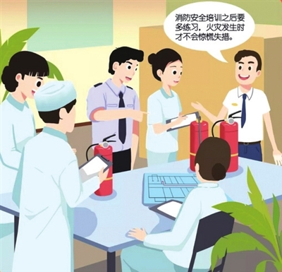 狠抓培训演练。要加强对全体员工的消防安全宣传教育培训,至少每半年开展1次灭火和应急疏散演练。要对新职工和转岗职工进行岗前消防知识培训,对住院患者和陪护人员及时开展消防安全提示。要做好消防安全宣传教育培训演练等工作,受训率必须达到100%,做到人人掌握消防常识,会查找火灾隐患、会扑救初起火灾、会组织人员疏散逃生、会开展消防安全宣传教育,掌握消防设施器材使用方法和逃生自救技能。结合老、弱、病、残、孕、幼的认知和行动特点,制定针对性强的灭火和应急疏散预案,明确每班次、各岗位人员及其报警、疏散和扑救初起火灾的职责,并每半年至少演练1次。配备相应的轮椅、担架等疏散工具,对无自理能力和行动不便的患者逐一明确疏散救护人员。医院消防安全重点单位应当根据需要设立微型消防站,配备必要的人员和消防器材,并定期进行培训和演练。