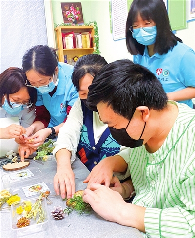 目前,天津医科大学肿瘤医院社会工作部共有4名专职社工、37名兼职社工,每年还有12名来自天津理工大学的实习生。袁丽就是其中的一名专职社工。她是天津理工大学社会工作者专业的研究生,2017年开始从事医务社工的工作,“我们会通过个案跟踪、小组支持等专业方法,为患者及家属提供心理疏导等人文服务。我们还关注医护群体,为他们疏导减压,消除职业倦怠感。我们更像是医护人员的助手,是医患之间的润滑剂,帮患者看见更强大的自己,提升医疗‘暖’实力。”