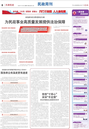 日前,市民政局、市文明办、市教委、市财政局、市卫健委、团市委、市老龄办、市少工委等八部门联合推出《关于深化我市“寸草心”“手足情”助老志愿服务工作的实施意见》,标志着经过两年多扎实实践,天津“寸草心”“手足情”助老志愿服务已经进入制度保障、融入日常、化作经常的新阶段,也标志着全市“津牌养老”志愿服务体系已初步形成。