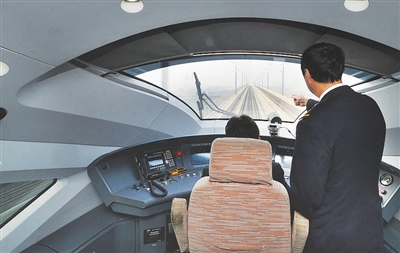 按图行车试验中,中国铁路北京局集团有限公司天津机务段司乘人员正驾驶动车组列车行驶在津兴城际铁路上。 摄影 本报记者 张磊 通讯员 杨宝森