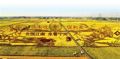 宁和稻香生态园主题为“庆丰收 促和美”的巨幅3D稻田画,以50798.39平方米的面积,成功挑战吉尼斯世界纪录,被认证为世界最大3D稻田画。 本报记者 汪伟 摄