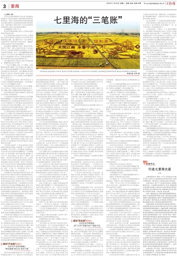“你们看,远处那一片水域,曾经是七里海湿地公园的观光栈道,早就拆除了,如今被芦苇海所覆盖。”站在天桥上,向北眺望七里海湿地,宁河区委书记白凤祥深有感触地说,“七里海确实是一块‘金字招牌’,我们不能守着‘金饭碗’过‘穷日子’,但也不能为了过‘富日子’而毁了‘金饭碗’。保护好生态环境是‘国之大者’,七里海不仅是宁河的生态地标,也是天津的生态明珠,更是美丽中国的生态品牌。这些年,我们始终牢记习近平总书记对七里海湿地保护的重要批示精神,坚持生态立区,算生态账、产业账、民生账。同样一片‘海’,不一样的靠‘海’吃‘海’,我们今天捧起‘金饭碗’,吃上‘生态饭’。”