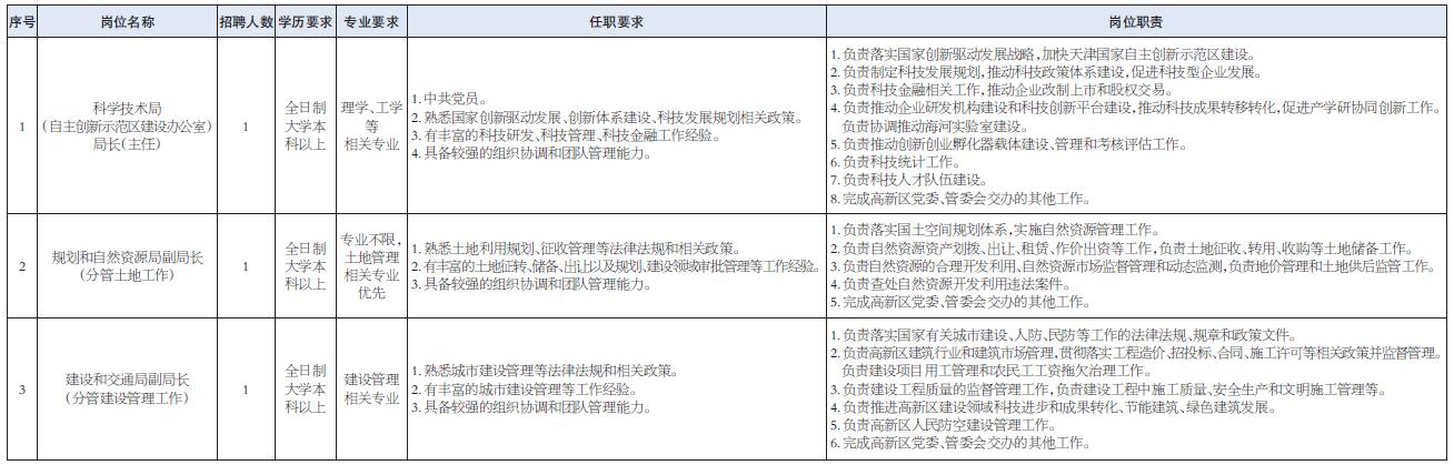 天津高新区推行法定机构改革,实行企业化管理,推行全员竞聘上岗和任期制。根据工作需要,本着公开、竞争、择优的原则,面向社会公开选聘中层领导干部3名。现公告如下: