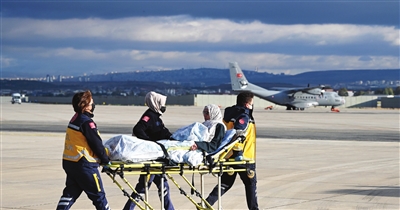 11月20日,在土耳其安卡拉,一名来自加沙的病人被运下飞机。