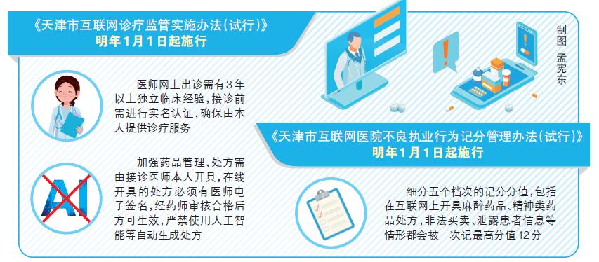 据了解,《天津市互联网诊疗监管实施办法(试行)》将于明年1月1日起施行。根据该办法,医师开展互联网诊疗活动应当依法取得相应执业资质,在互联网医院依托的实体医疗机构或其他医疗机构注册,具有3年以上独立临床工作经验;接诊前需进行实名认证,确保由本人提供诊疗服务。