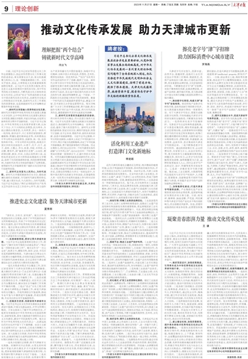 习近平总书记出席文化传承发展座谈会并发表重要讲话,从党和国家事业发展全局战略高度,对中华文化传承发展的一系列重大理论和现实问题作了全面系统深入阐述,为扎实推进中华民族现代文明和社会主义文化强国建设,指明了前进方向,提供了根本遵循。天津文化底蕴深厚,旅游资源丰富,探索传承守护中华文脉的新路径重任在肩。