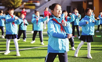 为丰富课间活动内容,提升课间活动质量,西安市曲江第六小学结合每个年龄段学生的特点,设置了五禽操、踢毽子、跳皮筋等活动,让孩子们在体育锻炼和趣味游戏中增强体质、乐享童年。 新华社发