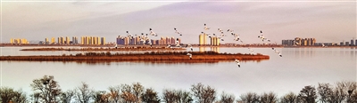 初冬时节,静海区团泊鸟类自然保护区碧波荡漾,湖面上成群结队的候鸟觅食嬉戏,人与自然和谐的画卷尽收眼底。 本报记者 潘立峰 通讯员 陈泽宇 摄