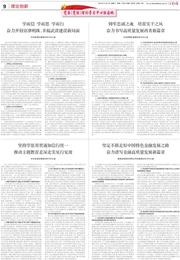 习近平新时代中国特色社会主义思想是我们做好一切工作的“纲”和“魂”,蕴含着科学的立场观点方法、深刻的道理学理哲理。宝坻区委坚持把“学思想”摆在首位、贯穿始终,着力在真学真懂、真信真用上下功夫。注重系统全面学,把举办读书班作为理论学习“第一课”、主题教育“第一步”,组织区、处两级领导班子利用一周时间,原原本本研读《习近平著作选读》等重要著作,重温习近平总书记对天津工作“三个着力”重要要求和一系列重要指示批示精神,系统把握“十个明确”“十四个坚持”“十三个方面成就”“六个必须坚持”等重要内容,做到整体把握、融会贯通。注重及时跟进学,严格落实“第一议题”制度,习近平总书记发表重要讲话、作出重要指示批示,都第一时间跟进学习,加强对全区113个处级领导班子和2043个基层党组织的联络指导,确保方向正确、上下贯通。注重联系实际学,坚持干什么就学什么、缺什么就补什么,紧密结合宝坻改革发展稳定实际,连续举办5期“宝坻发展大讲堂”,广泛开展调查研究,深入学习习近平总书记关于相关领域的重要论述,切实增强学习的针对性,努力提高学习实效。