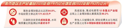 整体来看,我市25项主要指标进展总体符合预期。我市地区生产总值从2020年的1.4万亿元增加到2022年的1.63万亿元,比“十三五”末增加2303亿元。服务业增加值占比达到64.8%,市场经营主体达到171.83万户。污染防治攻坚战成效显著,地表水达到或好于Ⅲ类水体比例达到62.9%,水环境质量达到监测以来最好水平。城乡居民收入之比连续4年缩小。学前三年毛入园率超过93%。